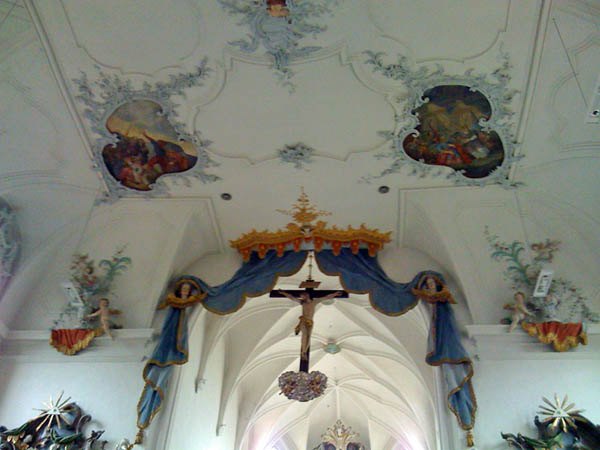De Franken van over de Rijn, gedeeltelijk onze voorouders, en de rococo – ik zou het verband zelf niet hebben gelegd, maar kijk, men wandelt in dat Frankenland het eerste het beste parochiekerkje in en treft dit aan.