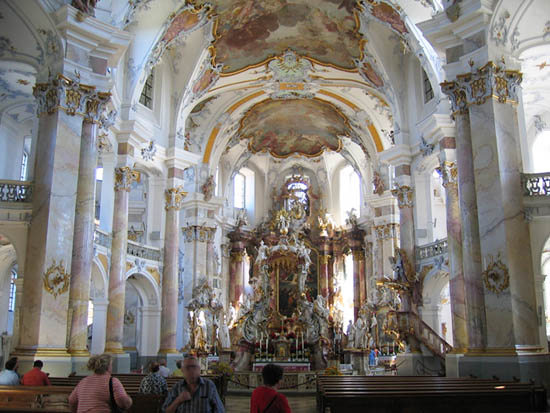 De kunsthistorische standaardwerken op de achterbank (Pevsner en Blunt) wijden er bladzijden aan, maar de nieuwe ANWB-reisgids voor Beieren en Franken vermeldt haar niet eens: de verbijsterende basiliek van Vierzehnheiligen. “Je moet bedenken,” zei mijn reisgenoot, “dat de bedoeling was: een visioen van de hemel te bouwen.” Wellicht zijn we geconditioneerd om hierbij aan nederige romaanse kerkjes te denken, loodzware