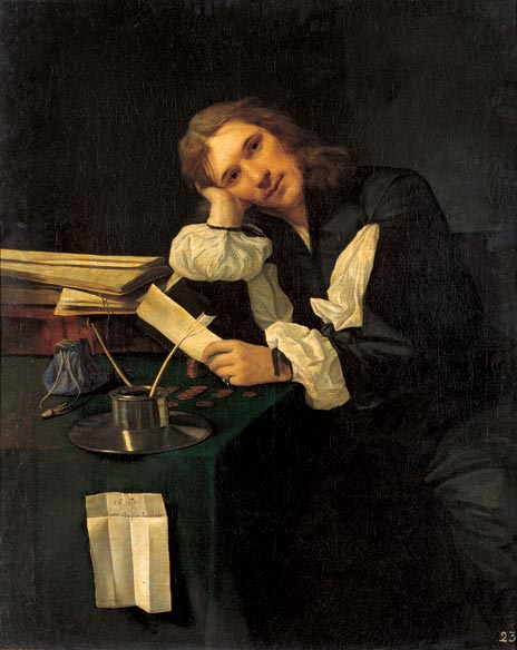 Een bijzondere schilder, Michael Sweerts (1618-1664). Brussel, Rome, Amsterdam, Marseille, Isfahan, Goa, dat is zijn traject. Mooie melancholie in dit schilderij: jongeman verdwaald tussen kasboeken, wisselkoersen en geldbuidels. Een mens zoals u en ik. Ratio quique reddenda, staat er op het vel papier dat aan het tafelkleed is gespeld: Iedereen moet zijn rekening betalen.
