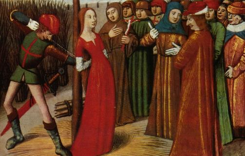 “De nobele jonkvrouw werd in Rouen bewaakt in een zeer strikte gevangenis; men zegt dat de Engelsen haar twee of drie keer hebben willen verbranden als ketter, ware daar niet Mijnheer de Dauphin van Frankrijk, die grote dreigementen aan de Engelsen heeft gezonden; maar desondanks hebben de Engelsen haar de derde keer, met behulp van enkele Fransen, levend laten verbranden op de markt van Rouen. Voor haar marteldood was zij berouwvol en zeer vroom gestemd; men zegt dat haar toen Mevrouw de heilige Catharina, maagd, verschenen is, die haar troostte, zeggend: ‘Dochter van God, houd vol in je geloof, daarmee zal je worden opgenomen in het getal van de maagden in het Paradijs in de glorie.’ En daarna stierf zij ingetogen. Om welke reden Mijnheer de Dauphin, Koning van Frankrijk, diepe rouw droeg, en aankondigde een vreselijke wraak op de Engelsen te zullen nemen… Men beweert dat de successen van de Fransen de marteldood van de Pucelle hebben veroorzaakt, dat de Engelsen zegden: ‘Is de jonkvrouw eenmaal dood, dan zal niets de Dauphin nog lukken.’ God geve dat het niet zo zal zijn!”