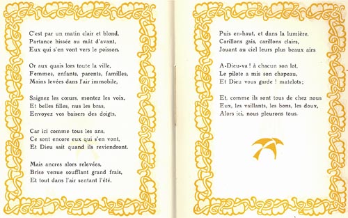 Toen ik amure opzocht in het woordenboek, herinnerde de vertaling me eraan dat ik dat al eens eerder heb gedaan: hals (van een zeil). Juist ja. Beter te onthouden door mensen die vaak aan de waterkant vertoeven. Als ik me in de zeilschepenterminologie verdiep, vind ik misschien iets waarmee ik in het Nederlands een gelijkaardige woordspeling kan maken op Chansons d’amour / Liefdesliederen? Twaalf gedichten over de IJslandvaarders die in mei uit Antwerpen vertrekken. C’est par un matin clair et blond …