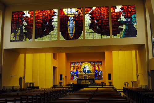 Het was decennia geleden dat ik nog eens in een schoolbus stapte, het was de eerste keer dat ik zulks deed in het gezelschap van een dichteres. Ik ken het H. Hartinstituut van Heverlee uit familieverhalen, een tante was er interne en herinnert zich met genoegen de zondagse uitstapjes naar ijssalon Au Bouquet Louvaniste op het Fochplein; mooie foto’s tonen haar in de schooltuin, naast haar oudste broer die uit het verre Hoogstraten samen met hun moeder op bezoek kwam. En ik had al gehoord over de modernistische kapel, ontworpen door Flor Van Reeth, met de glasramen van Eugeen Yoors. Vandaag zag ik dit fantastische ensemble voor het eerst met eigen ogen. Moeilijk in woorden of foto’s te vangen, het effect van een architectuur die je onweerstaanbaar voorwaarts stuwt en van glasramen die ieder ogenblik spelen met het licht. Wat een blauw gebruikte Yoors achter het altaar, wat een rood voor rozen en wat een gouden gloed. En zo word je weer eens bewust blij omdat je ogen hebt.
