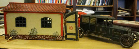 Veel speelgoed, in de mannelijke studeerkamer. Ernst Paul Lehmann & Co, opgericht in Brandenburg an der Havel in 1881. (En ik die dacht dat speelgoed, net als kerstversiering, afkomstig was uit fabrieken bevolkt door kabouters.) Garage en wagen in gelithografieerd blik, EPL 771 en 765. Een cadeautje, van iemand die er een jeugdherinnering bij vertelde. Kinderen van lang geleden moeten er passioneel van hebben gehouden en dolgelukkig mee zijn geweest. Die struikjes bij de garage alleen al!
