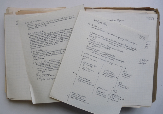 Gisteren kwam ik, geheel onverwacht, m’n overgrootvader tegen in het Stadsarchief van Mechelen. Ik raadpleegde de nalatenschap van genealoog Octave Le Maire – een Kolenwoud aan stambomen – en stuitte op een tiental brieven die mijn overgrootvader hem schreef in 1924 en 1925. Wonderlijk. Le Maire ploos werkelijk alles uit over families die aan de zijne verwant waren, en zo kwam ik te weten dat ik tot Tak E van de familie Huet behoor. In het dichte struikgewas van verdere verwantschappen dook volgens Le Maire mogelijk nog een dertiende-eeuwse heilige op, een theorietje zo bizar dat ik er al twee dagen om grijns en glimlach. De sarcofaag van de heilige is in 1964 teruggevonden als drinkbak voor koeien.