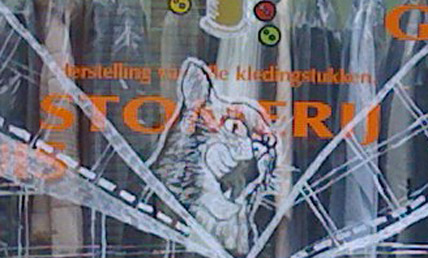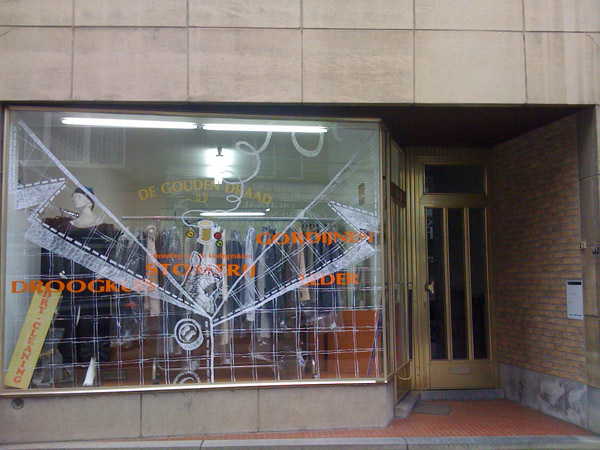 bigdraw5Ook de etalage van de kleermaker werd passend versierd, met revers en een katje, beschut achter de bovenste knop. En zo val ik dankzij The Big Draw van de ene verbazing in de andere.