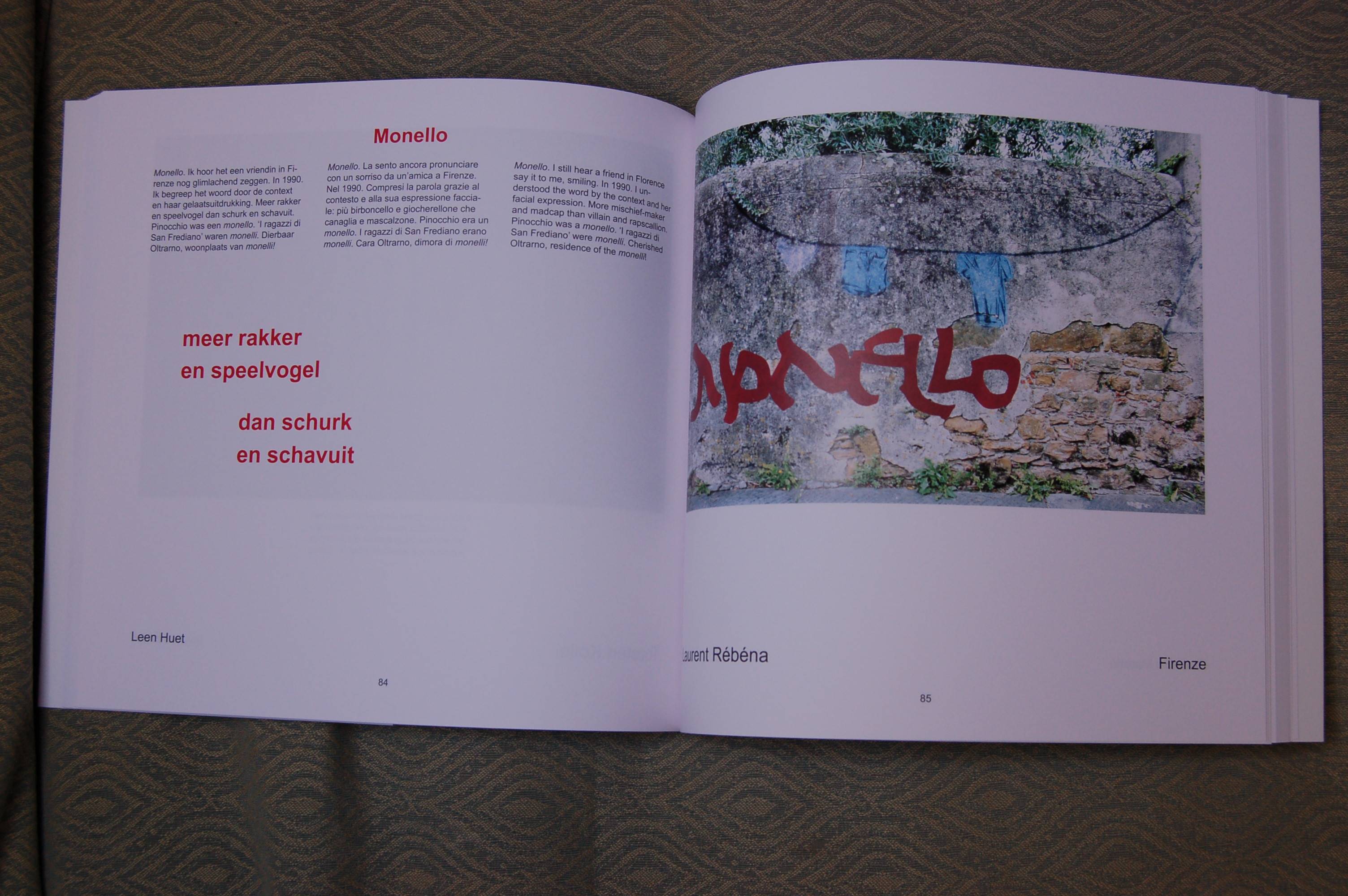 Joris Wouters, die al jaren Italiaanse muren fotografeert, vroeg liefhebbers van Italië om een favoriet woord te kiezen. Ik hoorde bij de gelukkigen en koos monello, mij geleerd door een goede vriendin in Firenze. Zou je het als “kapoen” kunnen vertalen? Dat leek me toen toch zo. Joris koos uit zijn archief de passende muur voor elk woord en zocht een kalligraaf om woord en drager te verenigen. Ik ben gelukkig met het mooie boek dat hieruit groeide en met de manier waarop Laurent Rébéna monello deed dansen als een dribbelend jongetje, op de perfecte Florentijnse muur.