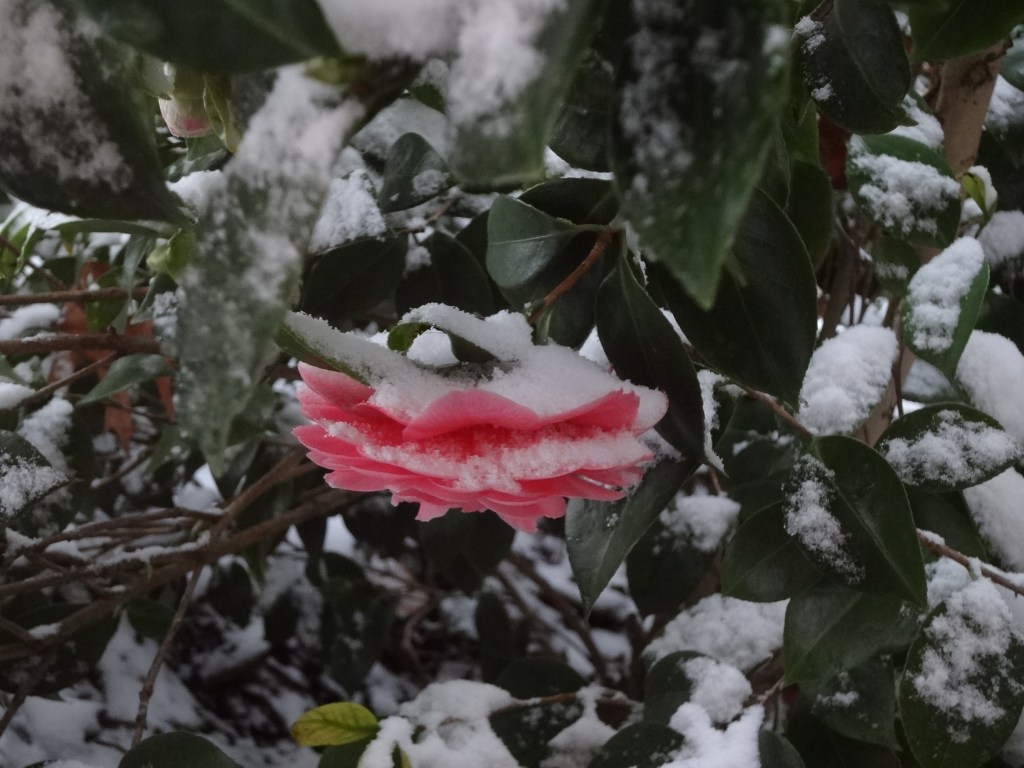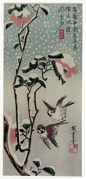 Hiroshige maakte deze prent omstreeks de tijd dat België ontstond. Camelia en mussen in de sneeuw. Vergelijk ik het met de foto’s die ik in de sneeuwtuin maakte, dan wordt het verschil tussen de hand van de kunstenaar en die van de leek snel duidelijk. Nog afgezien van het verschil in medium. Hoe die mussen in de vlucht vastgelegd zijn! Zonder zoomlens. De onderste heeft zelfs een grappige uitdrukking. Geen vlok valt verkeerd en de zegels dragen bij tot de schoonheid.