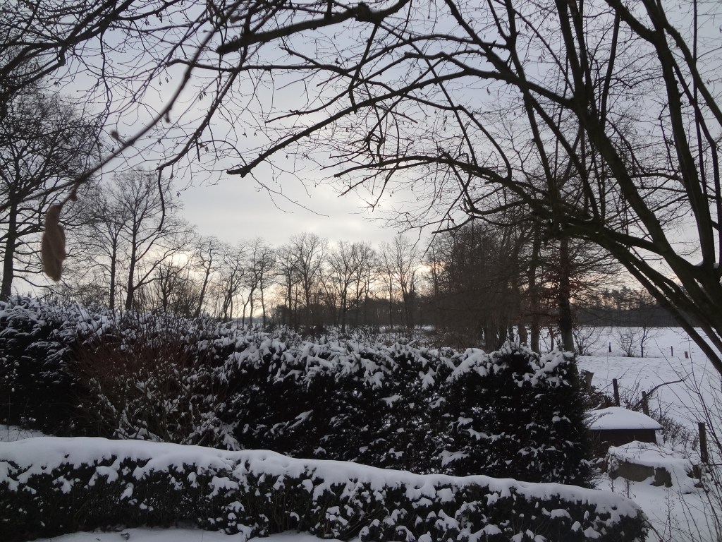 Deze morgen wandelde ik door een landschap dat ingekleurd leek te zijn door Fernand Khnopff. In werkelijkheid zat er ook een zweem van ijzig roze in de lucht, niet opgevangen door mijn cameraatje. De kauwen cirkelen om het voederhuisje dat normaal gezien alleen bezocht wordt door pimpel- en koolmezen, heggemussen en roodborstjes, heel soms ook door een merel. Wat eten ze haastig en onrustig.