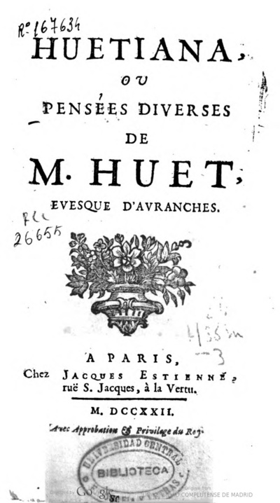 “Toeval bestaat niet,” beweert een vriend van me, en ik was opnieuw geneigd hem te geloven toen ik op een rek, tussen gelijkende en weinig opvallende banden, een boekje ontdekte van een naamgenoot. Deze naamgenoot leefde tussen 1630 en 1721 in Frankrijk; hij maakte dus zowel de tijd van de Zonnekoning mee als de rococo. De inleiding van het boekje, door de Parijse uitgever Jacques Etienne, beloofde veel goeds. “Als men in overweging wil nemen dat M. Huet eenennegentig jaar geleefd heeft, op enkele dagen na; dat hij zich van in zijn vroegste kindertijd aan de studie wijdde; dat hij bijna altijd geheel kon beschikken over zijn tijd; dat hij bijna altijd een uitstekende gezondheid genoot; dat hij zich bij het opstaan, bij het slapengaan en tijdens de maaltijden liet voorlezen door zijn personeel; dat samengevat, en om zijn eigen uitdrukking te gebruiken, ‘noch het vuur van de jeugd, noch de beslommering van zaken, noch de verscheidenheid aan verplichtingen, noch het gezelschap van zijn gelijken of de last van de maatschappij die ontembare liefde voor geleerdheid heeft kunnen milderen die hem altijd bezeten heeft’; dan denk ik dat men hieruit het besluit kan trekken dat M. Huet van alle mensen die ooit leefden, degene is die het meest gestudeerd heeft.”