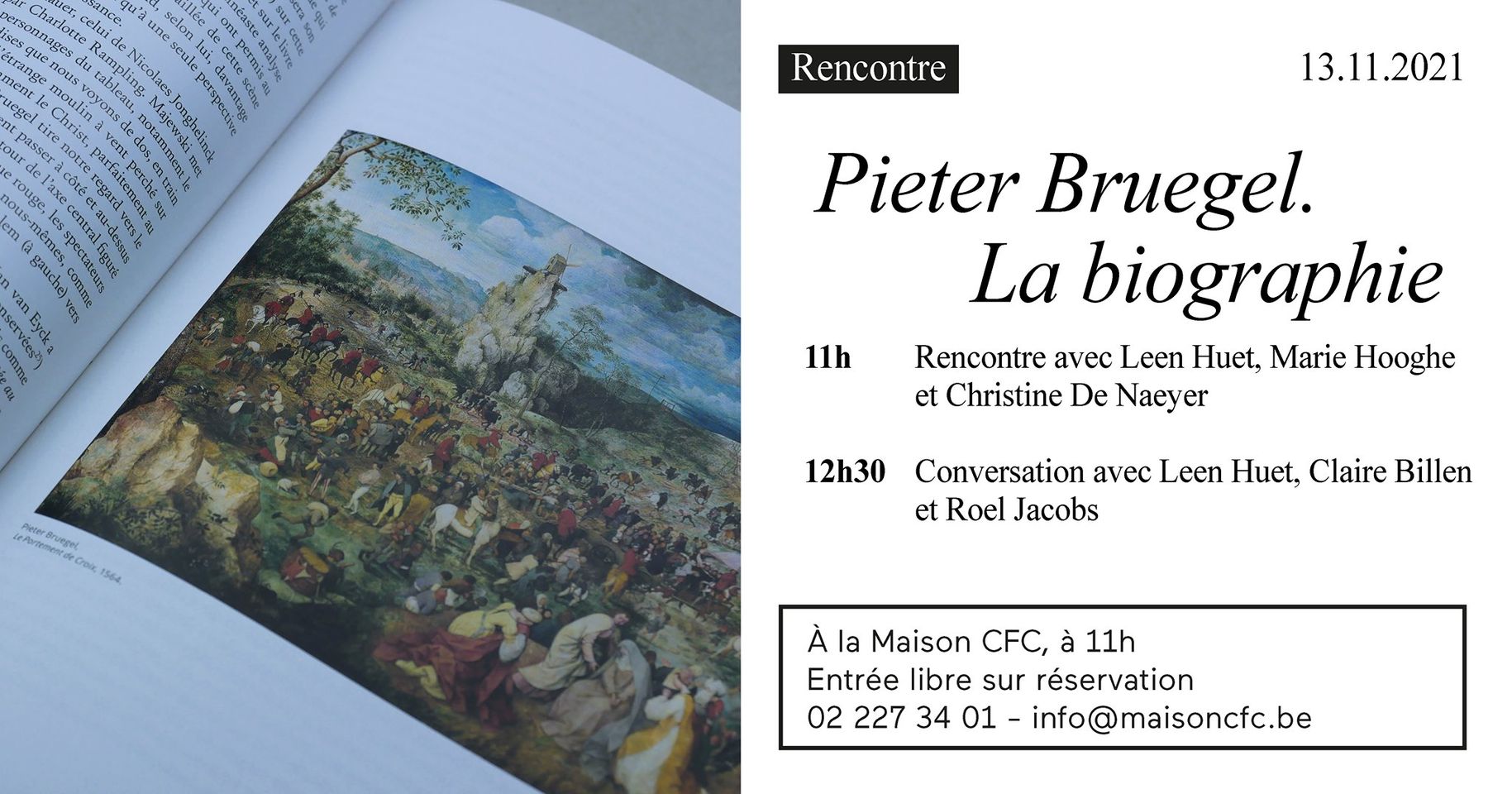 Conversatie over Bruegel. La biographie, met uitgeefster Christine De Naeyer, vertaalster Marie Hooghe en filosoof Jean-Claude Encalado. Donderdag 25 november om 20 u.