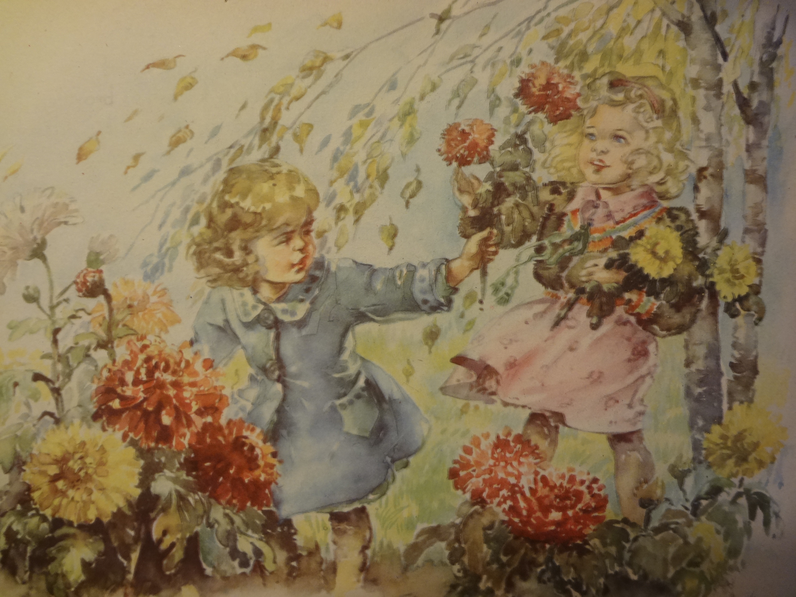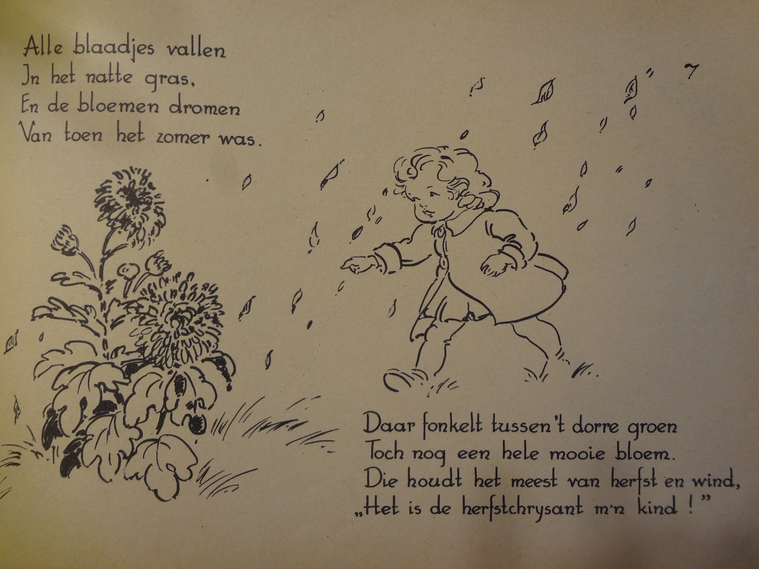 Uit: Herfstbladen, tekeningen van Corina, Versjes van F. Rens. De kinderen in dit boekje vingen al appels in hun schort, plukten bramen, verzamelden beukennootjes en kastanjes en bewonderden heksenkringen en de vlucht van trekvogels.