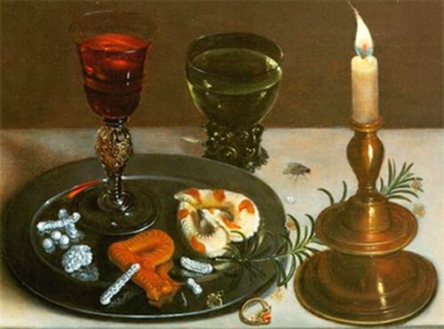Clara Peeters, Stilleven, 1607, privé-collectie. Suikergoed en wijn om een kraamvrouw te versterken?