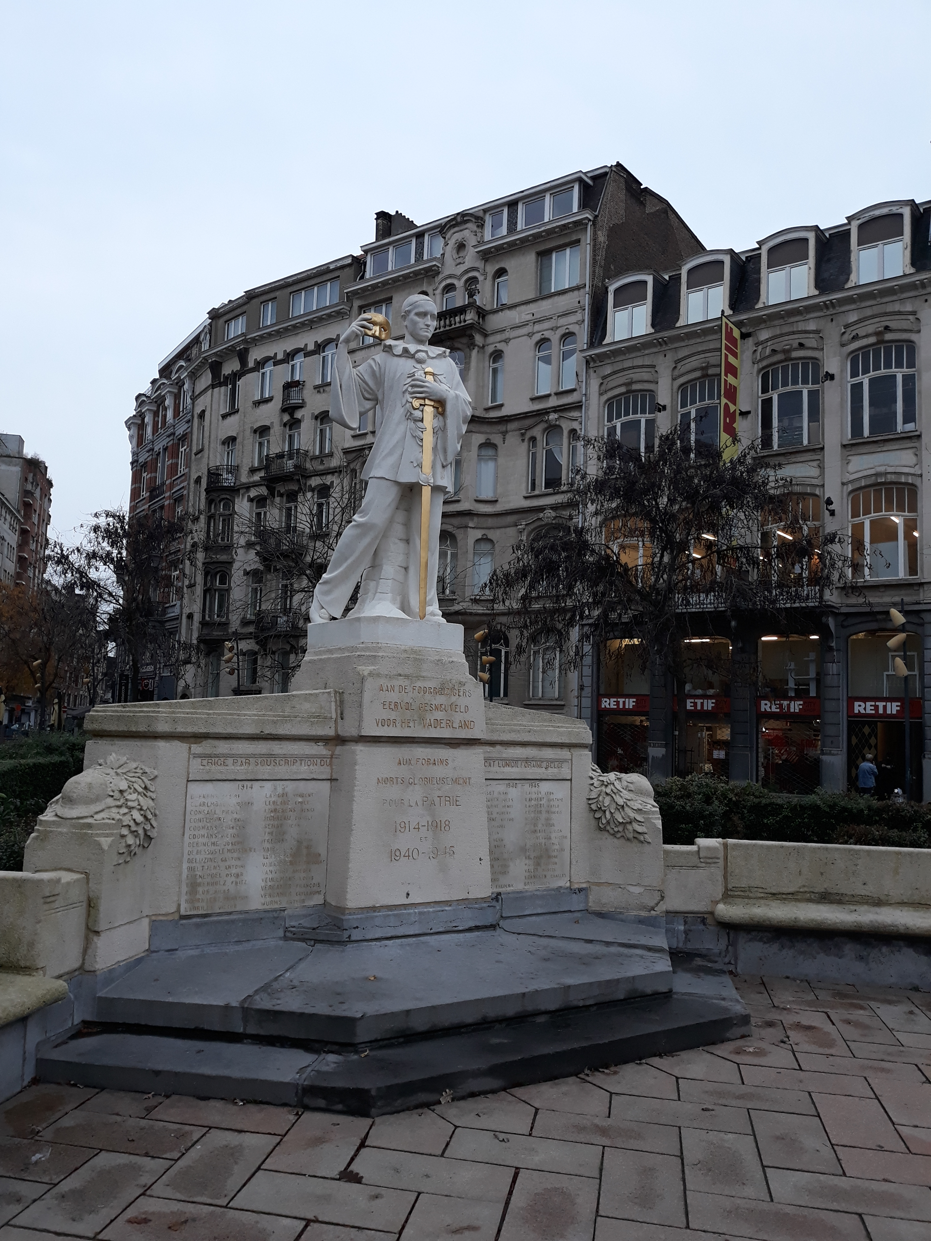 O, Brussel. Treinstation. Busstation. Brakke grond. Bouwwerf. Sexshop. Nachtwinkels. Wankele schuttingen. En dan opeens een mooi plein: Luchtvaartsquare – Square de l’Aviation. Met een hip hotel, een brasserie, een technische boekhandel. En dit standbeeld ter ere van de foorreizigers die heldhaftig sneuvelden tijdens de twee wereldoorlogen. De bruuske overgang tussen chaos en charme, dat blijft het mysterie van Brussel voor mij.