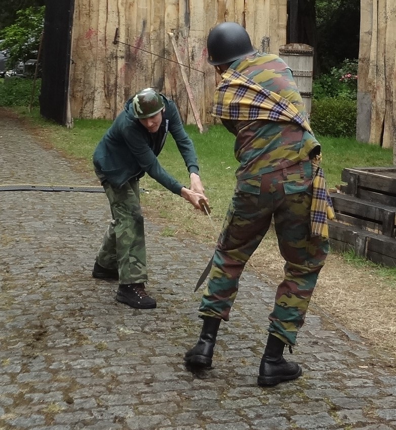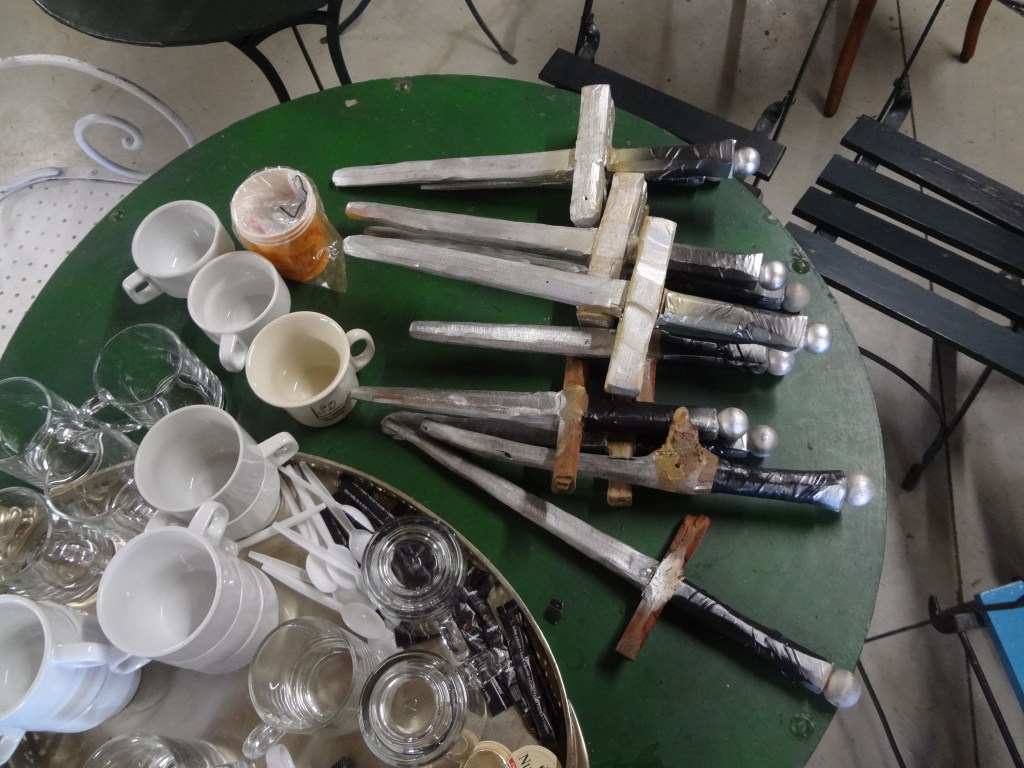 De zwaardvechters in Macbeth oefenen hun “theatrale gevechtstechnieken”onder leiding van een zwierige instructrice. De training lijkt op een kruising tussen klassiek ballet en tai chi. Het valt nog mee wanneer je al doende geen vijfvoetige jamben moet debiteren…. De tuin heeft al bijzondere dingen meegemaakt, maar nog geen zwaardgevechten, voor zover ik weet.