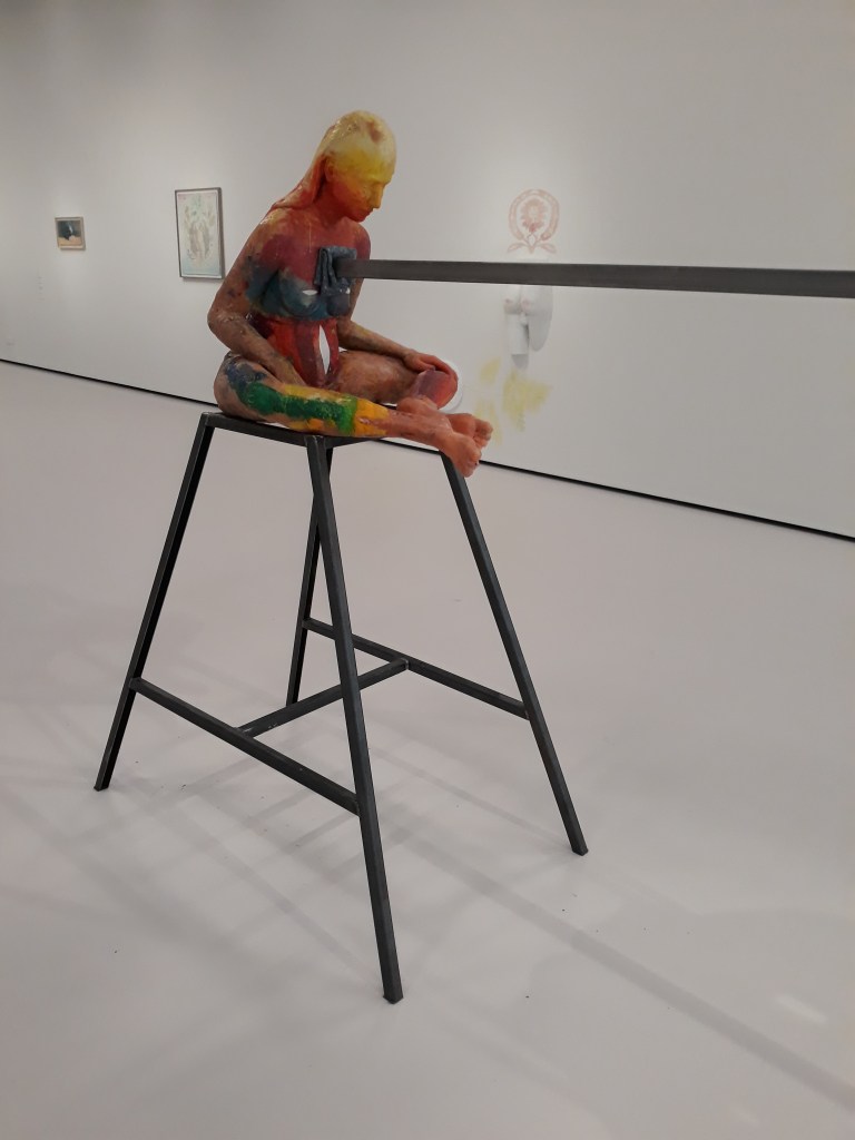 Een blij weerzien in Schiedam, met het werk van Femmy Otten. Haar eerste grote solotentoonstelling zag ik in CC de warande in Turnhout. In Schiedam herkende ik werk van toen in nieuwe configuraties, nieuwe context. Zoals deze Rainbow Woman II, die de expo opent en het blikveld van de bezoeker meteen doorkruist, doorstreept, schokt. Ik ontdekte nieuw werk. Ik zag hoe bezoekers geraakt werden, hoe ze deze kunst waarin zoveel vrouwelijke ervaring aan het licht komt, waardeerden.