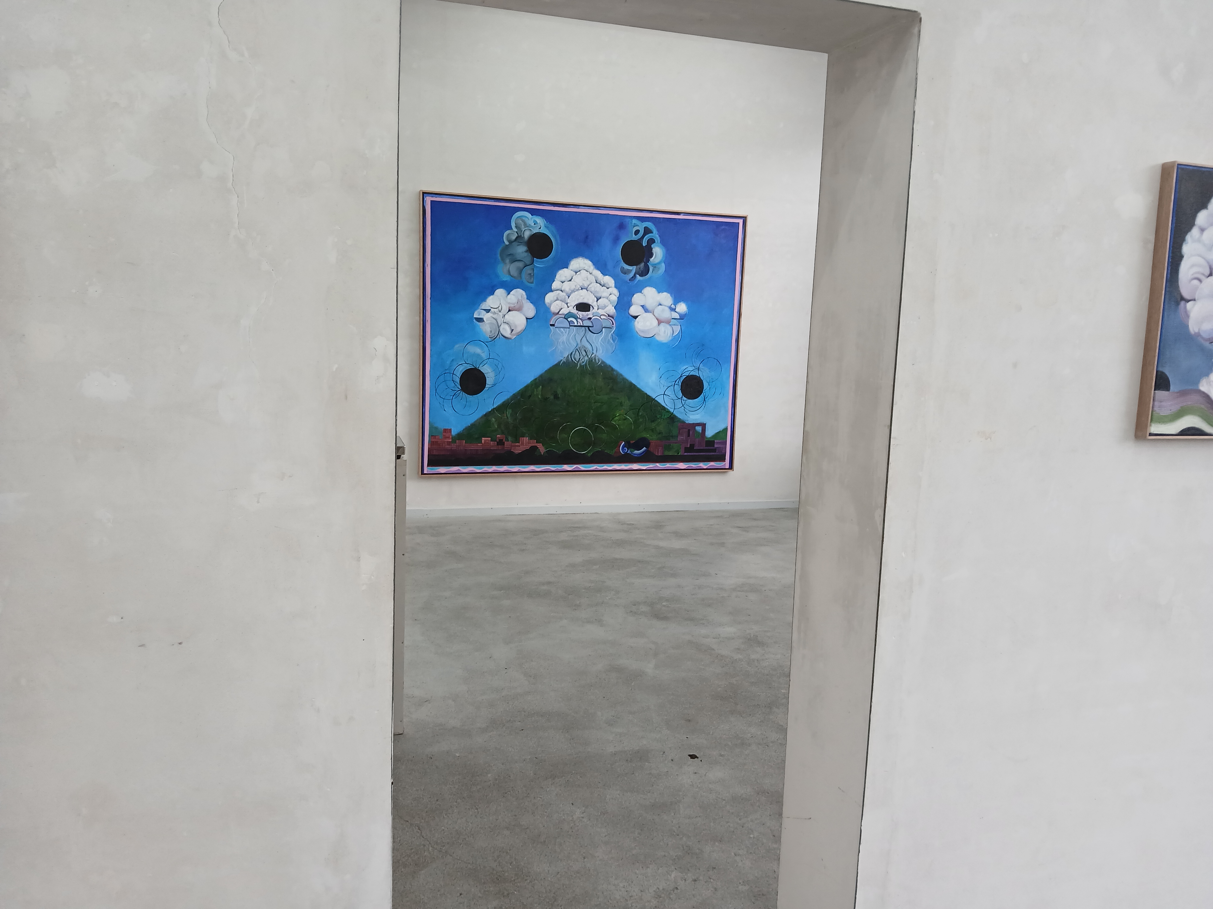 “Wat zit er in het gebied tussen wat wij kennen en wat we zien? Die vraag stelde de kunstenares zich terwijl ze de wolken en de wind boven de polders en de dijken waarnam. De wolk is een symbool van het ongrijpbaar goddelijke in het Oude Testament en ‘wind’ betekent daar ook adem en geest. In deze reeks schilderijen zijn de wolken oncontroleerbaar, vrij en transcendent. Ze aanschouwen de wereld onder zich met een vastberaden, soms aandoenlijk oog. Regen druipt in een tranendal. Gestapelde rechthoeken aan de onderrand verbeelden een menselijke poging tot greep en begrip, een futiele praktijk van beheersing: de bouw van een tempel? Een groene weg verdwijnt in een punt aan de horizon, zwarte hemellichamen volbrengen hun baan, dauw rijst op in melkachtige kristallen zuilen. Tussen wolken en aarde vormt zich een verticale band. Het wonder van de Jakobsladder is ook in alledaagse omgevingen te vinden.”