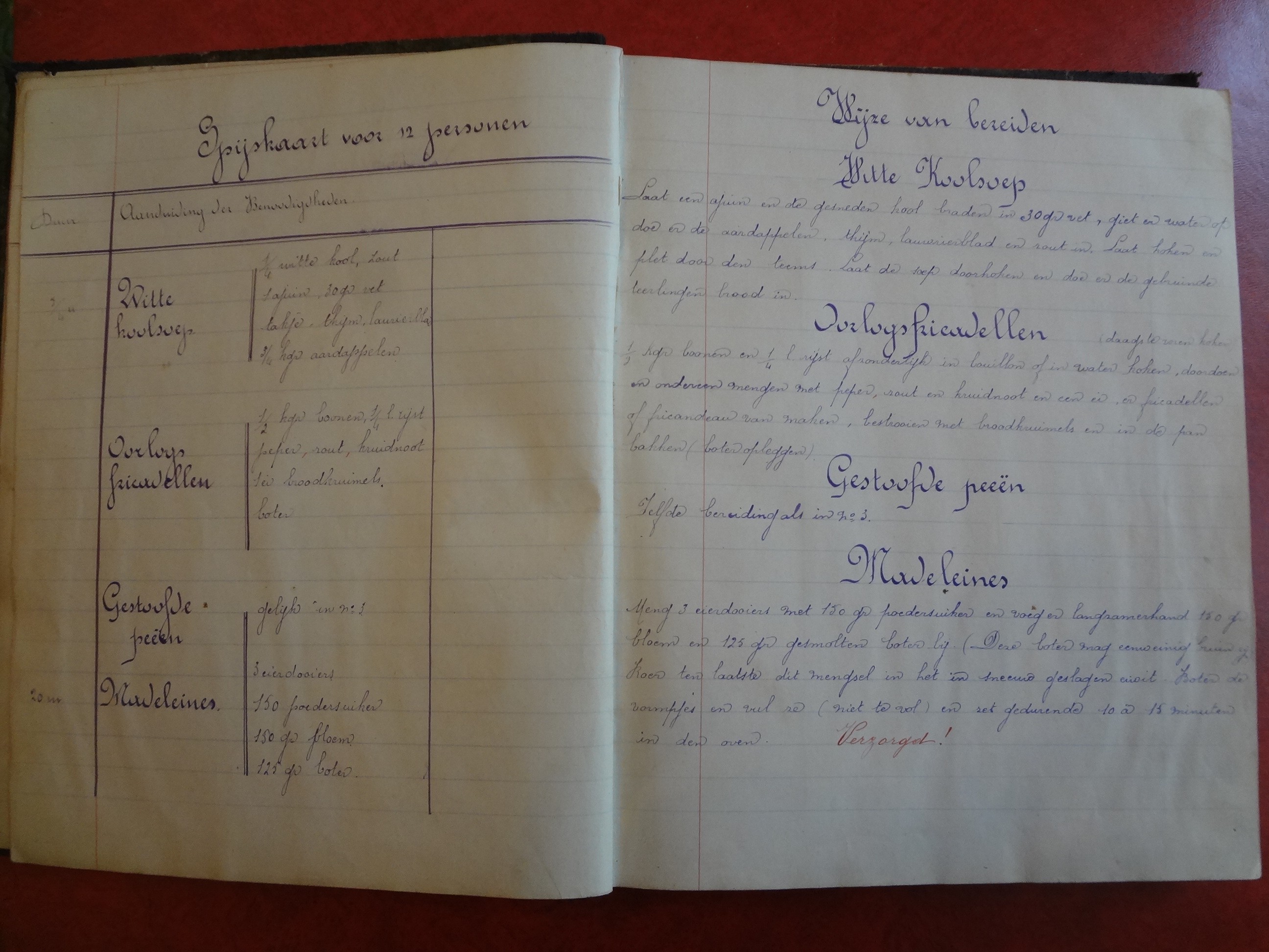 Al doende vind je een kookboekje terug, geschreven door je oudtante en begonnen op de huishoudschool in november 1919. Spijskaart voor 12 personen. Witte koolsoep – Oorlogsfricadellen – Gestoofde peeën – Madeleines. ‘Verzorgd!’, noteerde de lerares erbij, en dat lijkt me wel het minste wat je kunt zeggen.