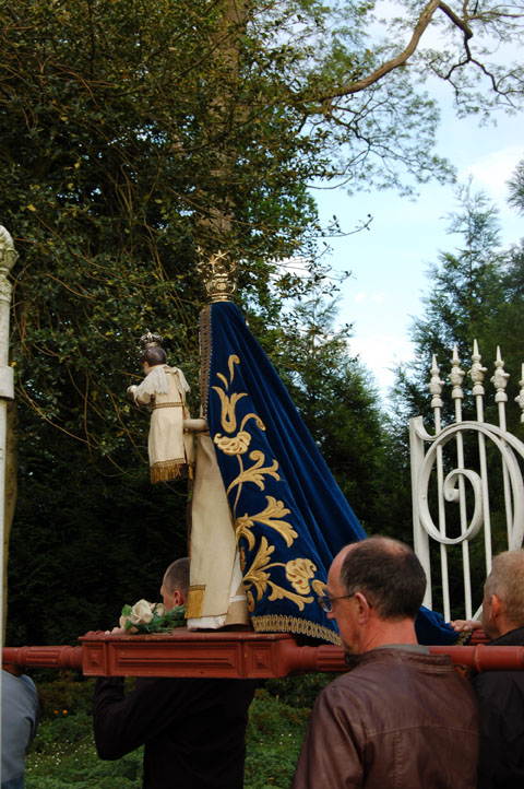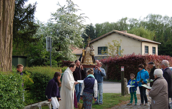 Met oude punaises, nieuwe slingers, trapladder en hamer maakten we Martials kapel klaar voor mei. De ijzige noordwester rukte intussen al een slinger los. Een vriendelijke voorbijganger of buur bevestigde hem deels opnieuw. (Zie het stuk in de heg.) Meiklokjes zijn er al, op de meidoorn is het nog wachten.