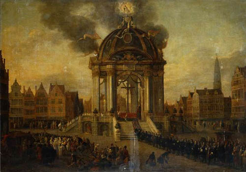 Een aandachtige lezer wees mij op dit schilderij uit de collectie van de familie Nabokov in Petersburg. Toen de Nabokovs in 1917 uit Rusland wegvluchtten, werden hun bezittingen genationaliseerd. Daartoe behoorde ook een bescheiden kunstcollectie met zestiende- en zeventiende-eeuwse schilderijen. Het was bijzonder plezierig om vast te stellen dat de Nabokovs in het verre oosten een Zicht op Antwerpen bezaten. Op dit optimistisch aan Hendrik van Minderhout toegeschreven doek zien we de Meir, met een cirkelvormige tempel boven het kruisbeeld, die was opgetrokken ter gelegenheid van de viering van honderd jaar reconciliatie met de Spaanse Kroon. In hedendaagse geschiedkundige termen zou ik moeten schrijven: de viering van honderd jaar Val van Antwerpen. Alexander Farnese heroverde Antwerpen op de opstandelingen in 1585 en een eeuw later organiseerde het Antwerpse stadsbestuur een groots spektakel ter herdenking van die terugkeer naar het wettelijk gezag en het ware geloof. Niet toevallig bleven hier schilderijen van bewaard: het ging om de omvangrijkste stadsversiering ooit, met – in tegenstelling tot enkele voorgaande edities – aanzienlijke inbreng van het verenigingsleven. De ronde tempel zou volgens beschrijvingen tweeëntwintig meter hoog zijn geweest en was ontworpen door stadsbouwmeester Jan Balthazar Bouvaert. “Eenen acht kanten wit-verwigen Marmeren Tempel […] hebbende een Coupola, ofte Italiaenschen Toren-lanterne,” volgens een getuige in augustus 1685. Op dit schilderij zien we hoe de processie door deze tijdelijke tempel trekt: de priesters dalen links al de trappen af naar de Huidevettersstraat, terwijl de rest van het gevolg nog vanuit de Meir naar het altaar stapt. Uit de wonden van het kruisbeeld stromen rode stralen: dit effect was verzorgd door loodgieter Jan Cras. Bedoeling was uiteraard het belang van de Eucharistie te onderstrepen.
