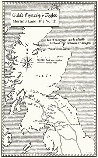 “In de koningshal heersen warmte en gelach, kameraadschap, poëzie en liederen. Terwijl regenwolken aanstormen van de zee van Rheged en de wind huilt over de besneeuwde hoogten van het Coed Celyddon, neemt Myrddin zijn plaats in aan het einde van het rustbed. Dienaren leggen enorme houtblokken in het vlammende haardvuur, en de geur van gebraden varkensvlees stijgt op uit de ketel. Laat de regen roffelen op het leistenen dak en tegen de stevige muren: de mede is in de hoorn en de harten zijn vrolijk.”